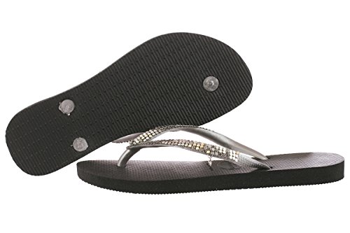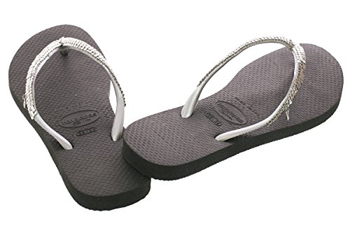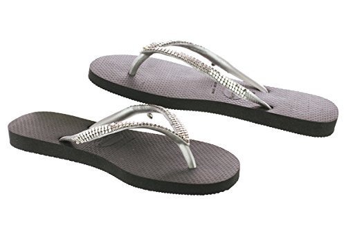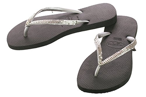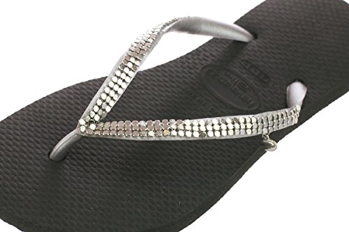 Binding : Shoes Product Description Enjoy your warm summer days in design in this comfortable, lightweight flip-flops from Havaianas. You won't be unnoticed with this special collection Slim Metal Mesh edition. On your traditional high quality rubber material sandals, they added 3 rows of metal mesh pieces made with crystallized Swarovski Elements, hand-sewn onto the strap by artisans in Alagoa Nova, Brazil. Silver metallic pieces will shine like diamond under the sun. Perfect match to compliment your summer outfit. 0