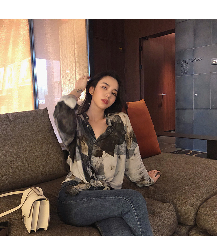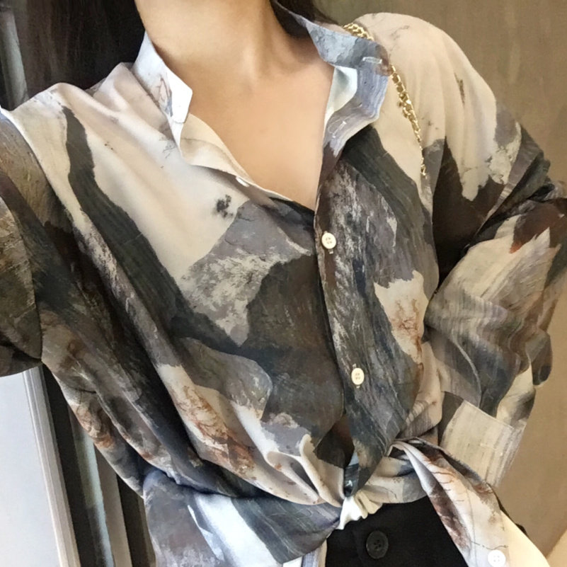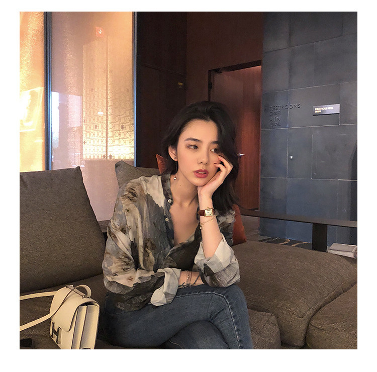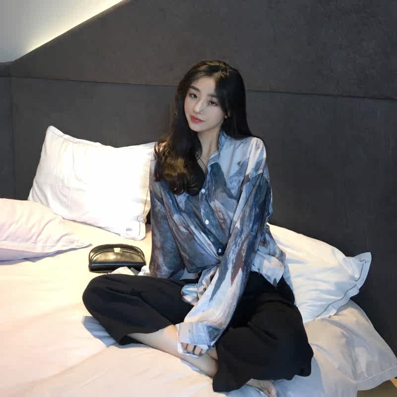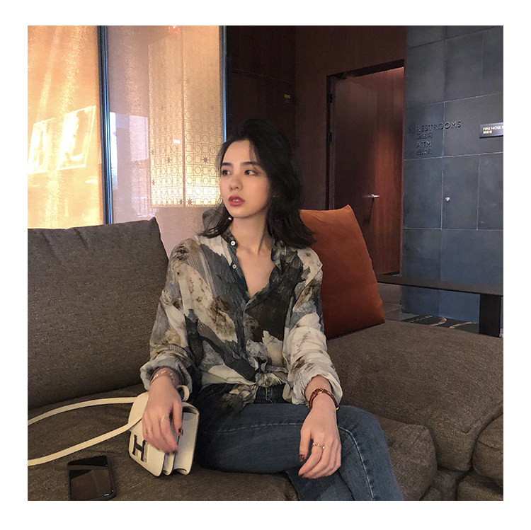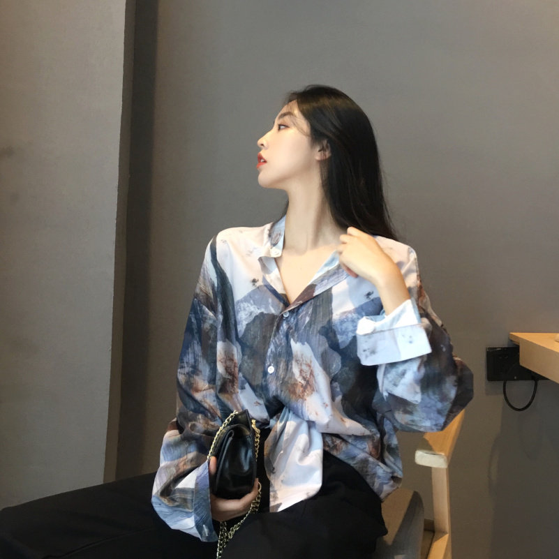 2018Ulzzang春夏秋冬女装韩版chic复古时尚简约宽松长袖印花衬衫上衣