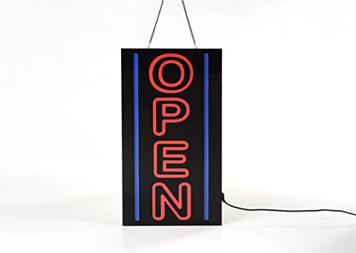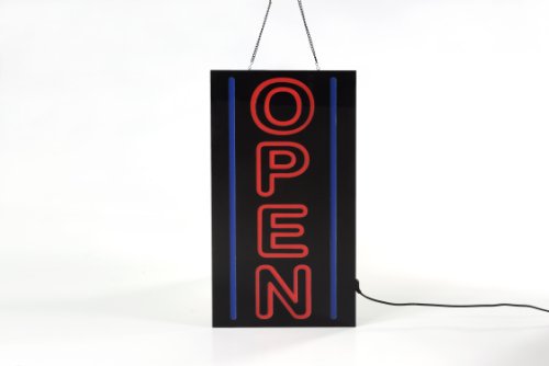 Displays2go Vertical Open Sign for Window Displays, Red Lettering with Blue Lines, Hanging LED Sign for Businesses Chain for Attachment to the Ceiling Included (JLEDOPVT)