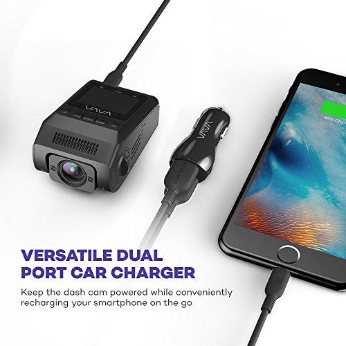 Versatile Dual Port Car Charger: Included car charger with 2 x USB ports allows you to keep the car video recorder powered while conveniently recharging your smartphone on the go