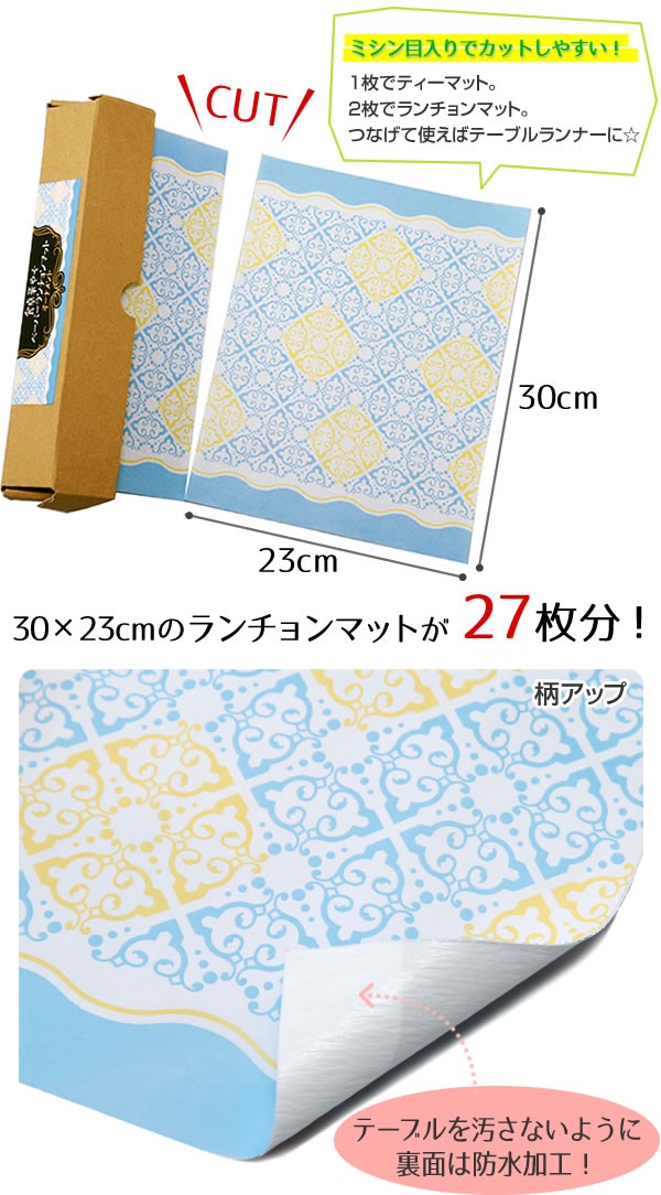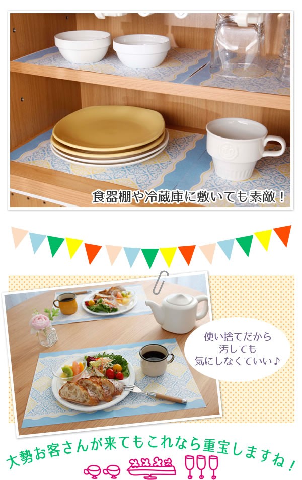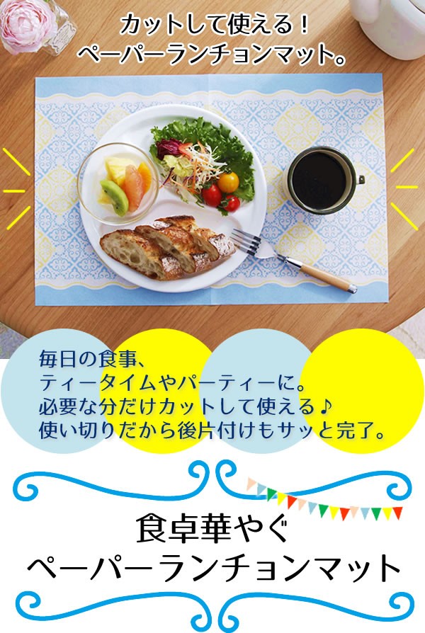 | <h1>汚れたら捨てるだけ、手軽に使えるペーパーランチョンマットです。ロール状でミシン目が入っているから好きな大きさでカット!ティーマット、ランチョンマット、長く使ってテーブルランナーにも!普段使いでもパーティーの時にも重宝します。洗濯の必要もないから後片付けがカンタン。ランチョンマット/パーティー/おしゃれ/使い捨て/手軽/汚れ/食器棚/冷蔵庫/飾り/敷く/汚れ防止/華やか/テーブルマット/テーブルランナー</h1> |