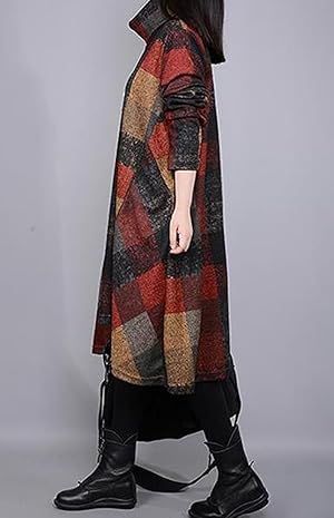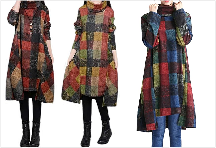 秋冬 カラフル チェック 長袖 チュニック レイヤード ワンピース レディース チュニック ゆったり 大きい サイズ ハイネック