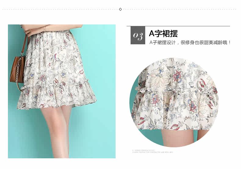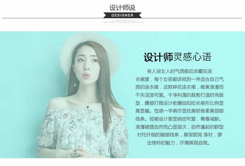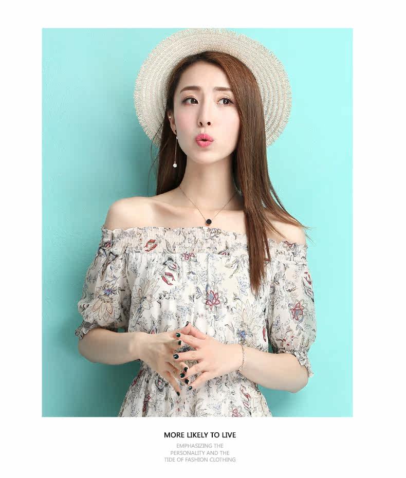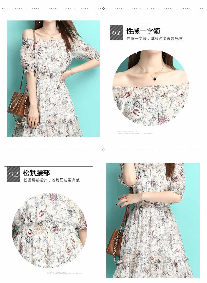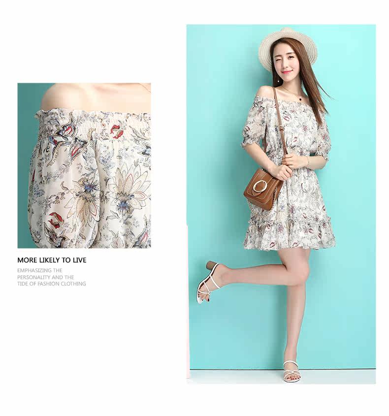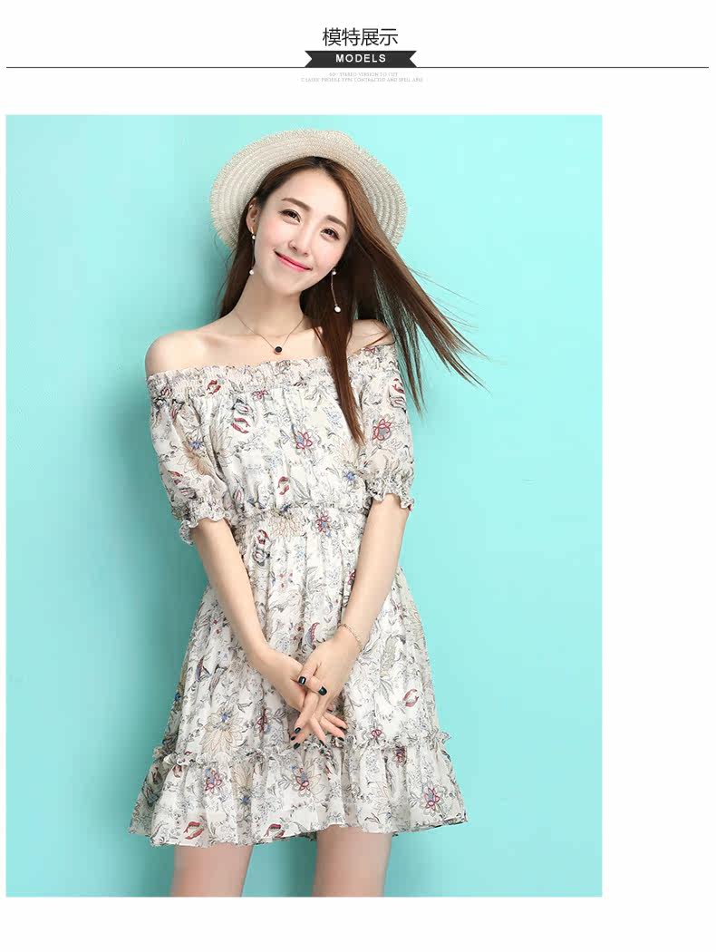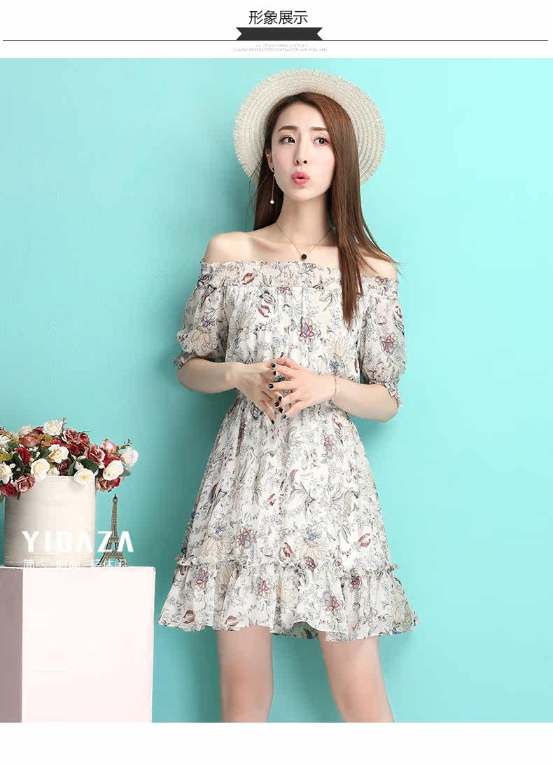 夏装新款收腰短裙 小碎花雪纺连衣裙 一字大宽领露肩性感女装
