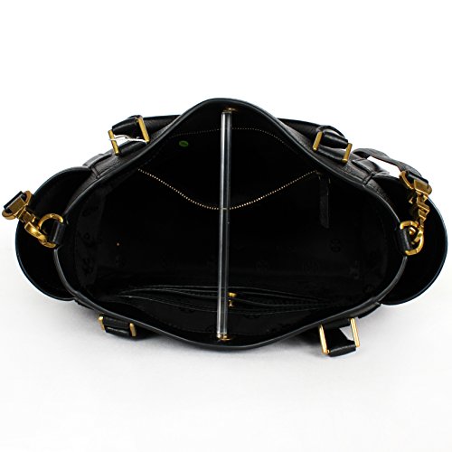 Magnetic snap closure. Tubular leather top handles. Double T logo.