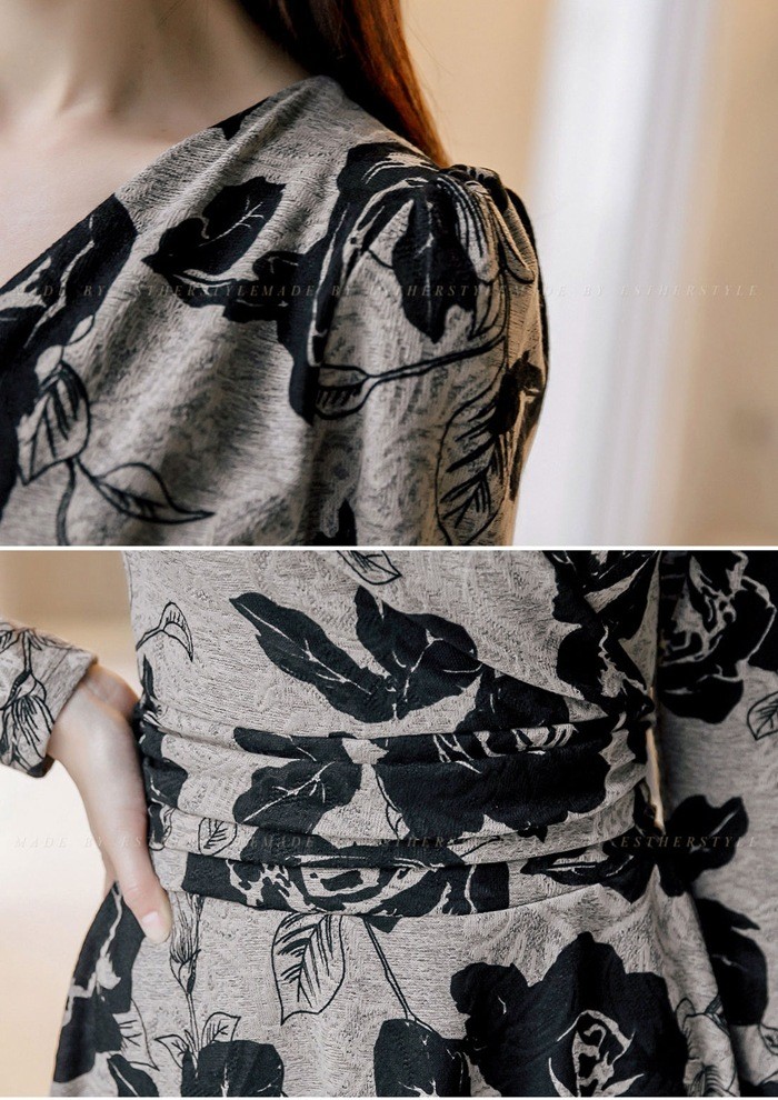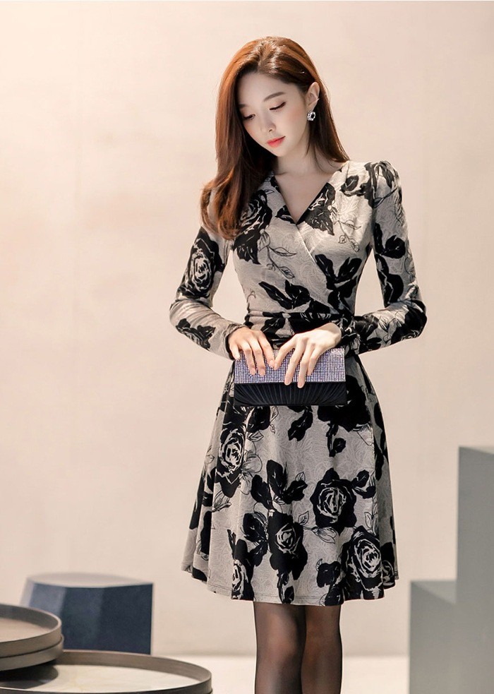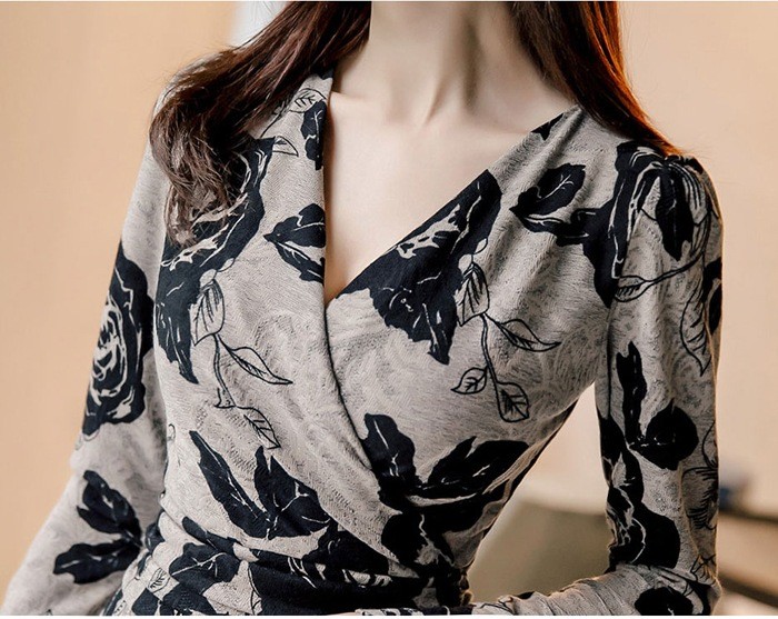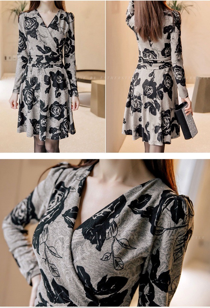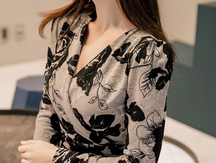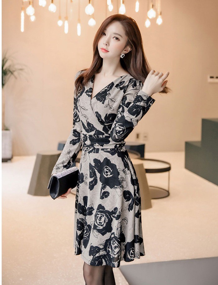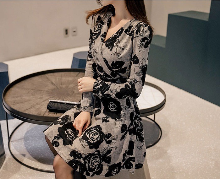 商品名:カシュクールワンピース 花柄 フラワー 長袖 膝丈