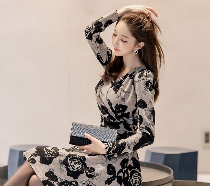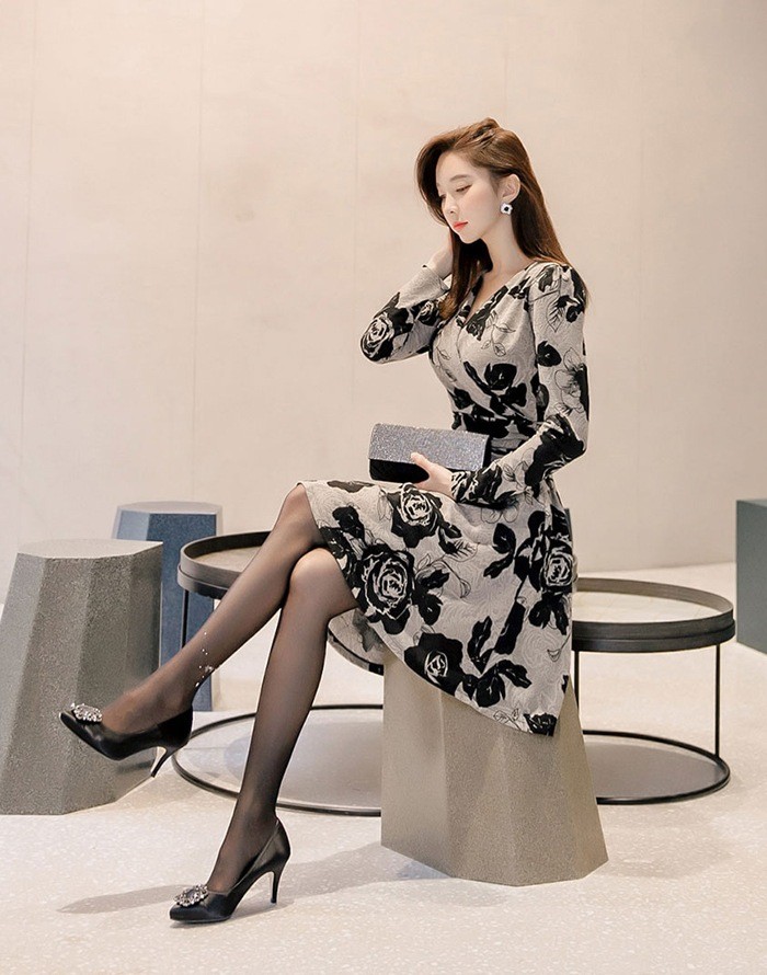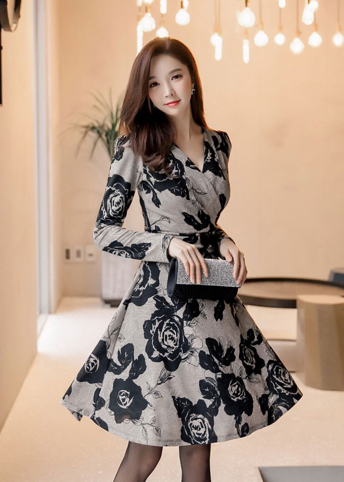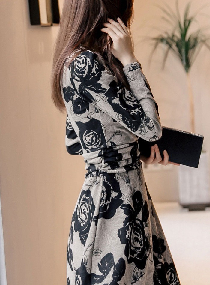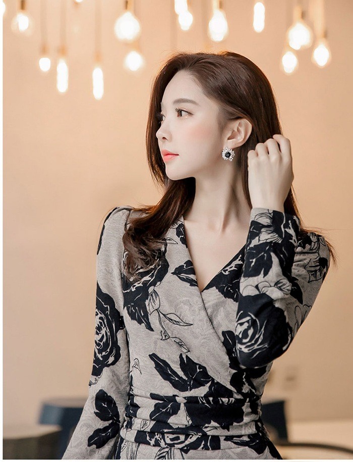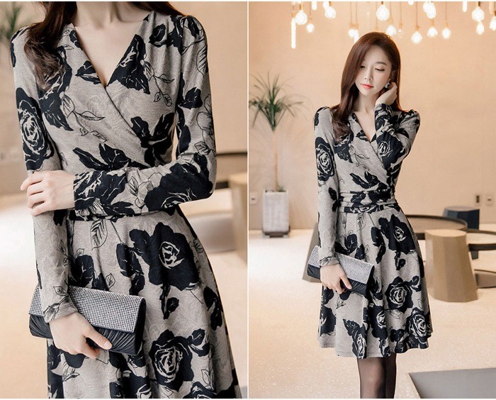 商品名:カシュクールワンピース 花柄 フラワー 長袖 膝丈