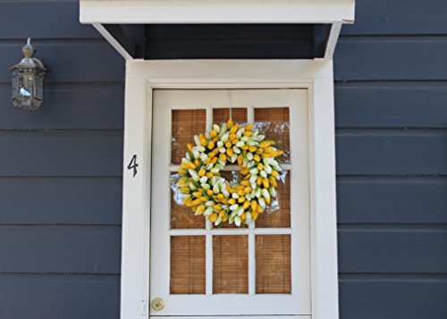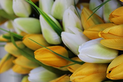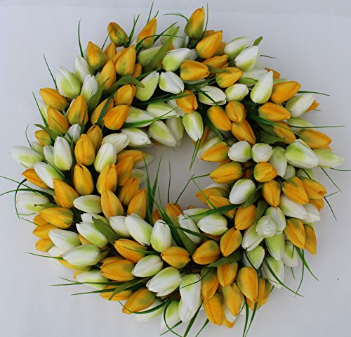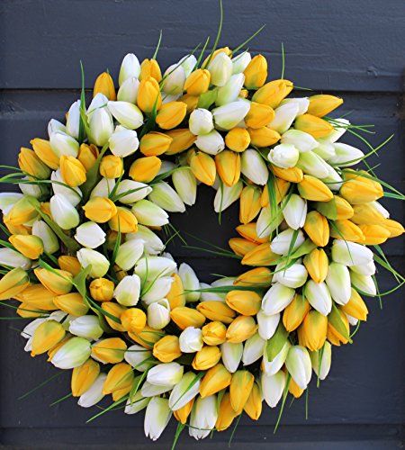 Crafted with YELLOW AND WHITE TULIPS. The white tulips have hints of green on them. Handcrafted on a natural base with 240 designer quality silk tulip heads. This is a spring best seller.
