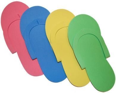 -. Feature : Pedicure Foam Slippers / 24 Pairs ASSORTED / These colorful pedicure slippers are durable, disposable, and inexpensive. / Adult Size Slippers but you can cut them down for kids use.