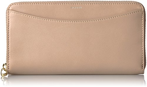 The continental leather zip wallet contains a center zip pocket, two bill slots, 12 credit card slots and a cell phone compartment, with one slip pocket on the exterior. It zips shut by the leather pull tab.