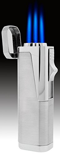 The Typhoon butane lighter is among one of the best lighters we've seen at this price point. A wind resistant triple laser flame lighter with a flip top protective lid. Its potent triple flame makes lighting large cigars effortless. Comes with built in cigar punch cutter that folds outward and retracts easily after use. Retractable Cigar Bullet/Punch Cutter at the Bottom of Lighter, Wind Resistant Adjustable Flame, Universal Refilling Valve, Silver Finish with Chrome Accents, Set in a Handsome Black Case, Size: 3.20 " H x 1.25" W, Weight: 2.25 oz.Feature