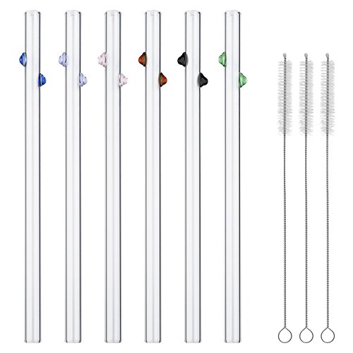 GINOVO 200mm * 10mm Straight Reusable Glass Drinking Straws, Set of 6 with 3 Cleaning Brushes, Multi Color
