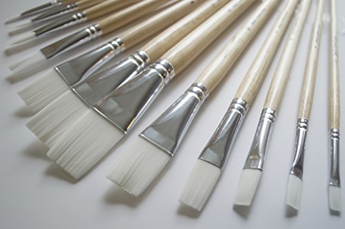 Jerry Q Art 12 PC White Synthetic Hair Flat Brush Set With Long Wood Handles For Watercolor and Acrylic JQ66051