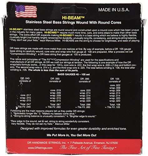 Gauges 50-70-90-110 Roundwound and constructed upon a round core Highly flexible Musically bright without harshness Long life, consistency, and string-to-string balance Fit scale lengths up to 37-3/4"