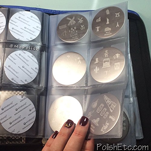 - Feature : Perfect organizer for stamping nail-art lovers / Find your favorite stamping plate in no time / 20 vinyl pages; 6 pockets each page / Holds total of 240 pieces 5.6cm diameter round stamping plate / Bonus mesh pouch to store small accessories or extra stamping plates