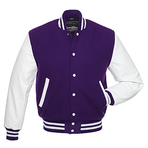 Product Description Stewart Strauss Varsity Letterman Jacket with Purple wool body, White leather sleeves and pockets, White snaps, Purple knit trim with 2 White Stripes, and quilted lining. 0