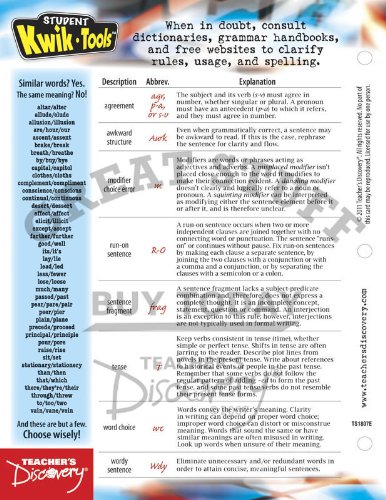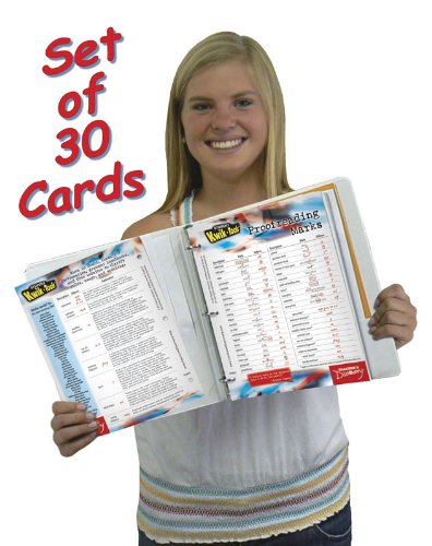 Studio : Teacher's Discovery Publisher : Teacher's Discovery Binding : Office Product Product Description Em dash, bold, parentheses and capitalization are some of the 42 proofreading marks featured on the front side of this study card. The back of the card includes explanations of subject-verb agreement, noun-antecedent agreement, awkward sentence structure, modifier errors, run-on sentence remedies, sentence fragments, tense usage, word choices and a list of commonly-confused words. A great, quick-reference tool for your students. The hole-punched cards easily fit a 3-ring binder. Teacher's Discovery, ⓒ2011, set of 30 cards, printed on card stock, 8 x 11 inches, middle school/high school. 0