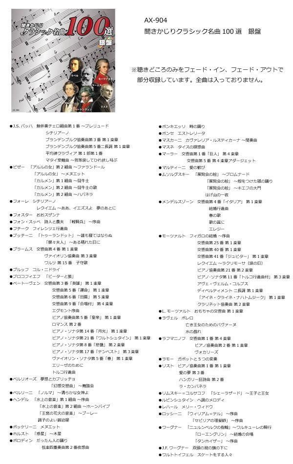 | セット内容 | AX-903(聞きかじりクラシック名曲100選金盤)、AX-904(聞きかじりクラシック名曲100選銀盤) |