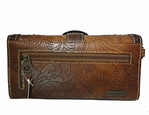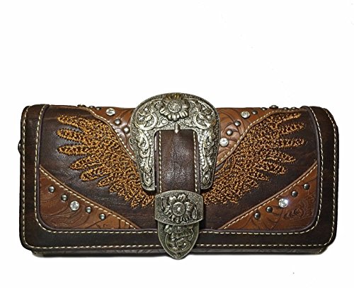 Studio : Western Fashion Publisher : Western Fashion Binding : Apparel Product Description Montana West Embroidered Angle Wings, Westen Buckle Tri-fold Wristlet Wallet Wristlet Wallet: 7.5 x 4.5 x 1 - Floral Embossed Exterior - Embroidered Angel Wings - Floral Ornate Western Buckle - A zippered pocket on back -3 ID slots, 2 Compartments with Zipper pocket in middle, 2 bill slots, 11 Card Slots - Detachable Wristlet band 0