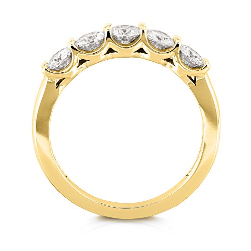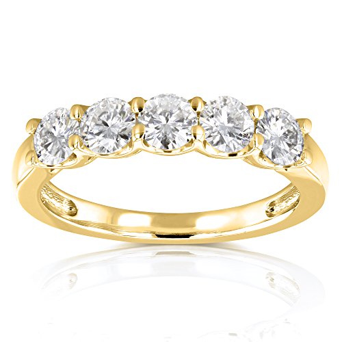 -. Binding : Jewelry -. Brand : Kobelli -. Department : womens -. Feature : Near colorless lab-created gemstone wedding band by Kobelli / Five-stone moissanite ring in 14k yellow gold / Classic prong setting on traditional bridal fashion / Designed, made, and distributed by Kobelli in Los Angeles, California / Complimentary gift box included -. Label : KOBELLI -. Manufacturer : KOBELLI -. ProductGroup : Jewelry -. ProductTypeName : FASHIONRING -. Publisher : KOBELLI -. Studio : KOBELLI -. Title : Five Stone 4/5 Carat TGW Round Brilliant Near Colorless Moissanite (HI) Bridal Wedding Band in 14k Yellow Gold