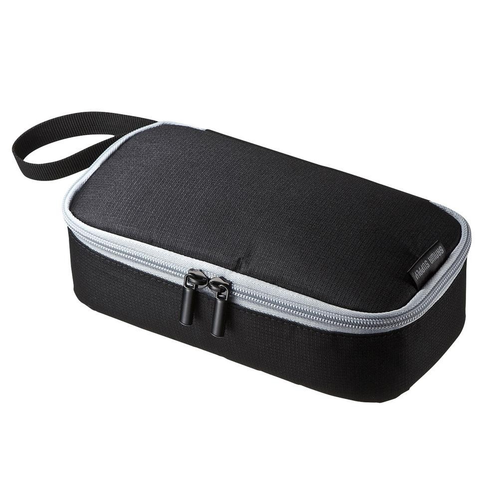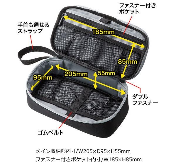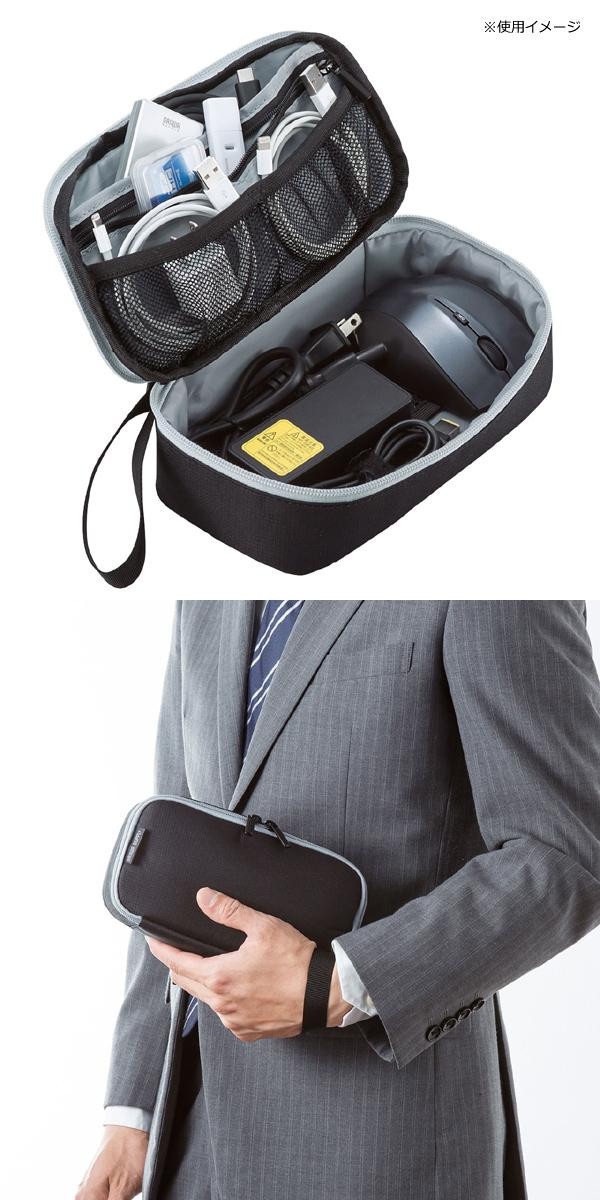 | モバイルバッテリーや充電器、ACアダプタ、マウスなどの厚みのある小物を整理収納できます。オープンポケットを1箇所、ファスナー付きポケットを1箇所、メッシュポケットを4箇所搭載しています。カバンの隙間にちょうど良いサイズで旅行や出張、通勤に便利です。 |