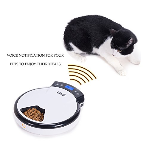 -. Feature : SMART-TIME TECHNOLOGY: Thanks to the smart timer, this pet feeder can maintain a regular feeding schedule for your pet while you're away and can serve your pet up to 5 meals! / VERSATILE: Designed with 5 x 240ml (1 cup) meal compartments to feed your pet with both dry and wet food, and the tray is easy to clean to make feeding your pet easier than ever! / PERSONAL VOICE RECORDING: Make meal time extra special for your furry friends by recording an 8 second personal audio message that will repeat 3 times so your pet won't forget to eat! / VIBRANT LED DISPLAY: An integrated LED display makes setting your pet's schedule easy and provides a low-battery indicator so you know ahead of time when the feeder needs to be charged! / MULTIPLE CHARGING OPTIONS: Dual power systems allow this automatic pet feeder to work with a power cable or batteries, so there is no need to worry that the power may shut off while you're away.