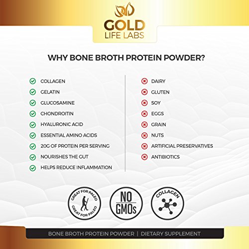 Gold Life Labs Bone Broth Protein Powder provides all the benefits of bone broth without the hassle of actually having to cook bones! Our protein powder is great for paleo diets and provides a modern solution (based on ancient wisdom) to our toxic and stressful world.