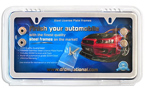 License Plate Holder - Stainless Steel (SAE 304 Premium Metal) Polished To A Chrome Plated Mirror Like Finish Includes Stainless Steel Anti-Theft Screw Covers and Screws Lifetime No Hassel Warranty - DFDM National B0115Q1BPU
