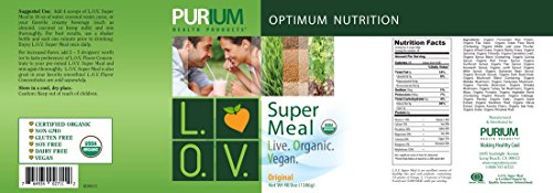 -. Feature : Purium's L.O.V.E. Super MealTM is composed of 36 pure, premium, natural, whole food ingredients. It contains 12 green foods, 10 vegetables, 9 sprouts, and 5 mushrooms - and only 2 grams of naturally occurring sugar. It also has 20 grams of vegan protein from organic fermented rice, 9 grams of fiber, and more antioxidants than 10 servings of fruits and veggies! / L.O.V.E Super Meal is a meal replacement that is also 7 products in 1: Weight Loss Formula + Protein Drink + Fiber Supplement + Essential Fatty Acid Supplement + Super-Antioxidant + Immune Support Supplement + Energy Drink! / Servings per container: 10 (you will receive 3 containers) / Purium's new L.O.V.E. Super Meal was recently endorsed by the Diabetes Resource Center! / .