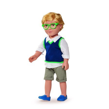 -. Feature : 18" school boy doll. / Shorts, white shirt, navy sweater vest. / Rooted blond hair/green eyes. / Green rimmed glasses.