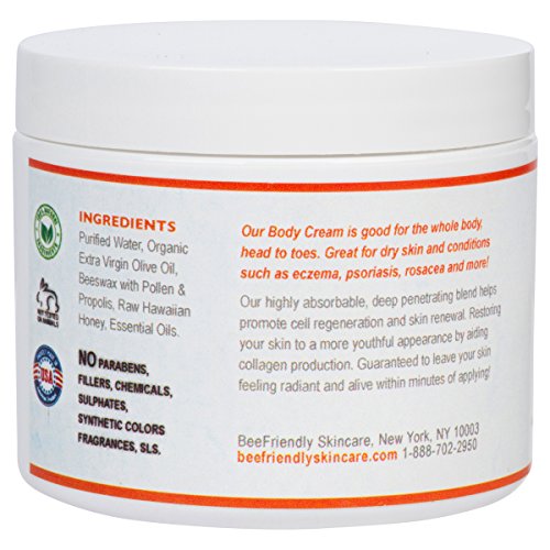 -. Feature : MAKES YOUR SKIN COME TO LIFE - This All Natural and Organic, Deeply Moisturizing All Purpose Premium Body Cream will leave your skin feeling smooth, soft, moisturized, well nourished and all around HEALTHY and YOUTHFUL. Gentle enough for everyday use and naturally strong enough to tackle your skin conditions. The Ultimate All Purpose Body Cream / HEALING AND REGENERATING - Highly beneficial for those with ECZEMA, PSORIASIS and/or Dry Skin Conditions. This ultra-luxurious creams regenerative properties aid in restoring your skin to its once youthful state by improving its elasticity and tones / FEED YOUR SKIN - This Body Cream doesn't just sit on your skin, it gets absorbed deeply within your skin and starts healing and nourishing your skin from within, where it really matters. If your skin could speak, it would request BeeFriendly's Body Cream! / ALL NATURAL AND ORGANIC - Handmade by Holistic BeeKeepers in Hawaii. The exact same all natural ingredients that our ancestors have been using for centuries. NO CHEMICALS, NO PARABENS, NO FRAGRANCES, NO ANIMAL TESTING! / MADE IN USA - Specially P.R.Iced Limited Supply 4 oz Size - Long Lasting! This Is The Largest Size We Carry!
