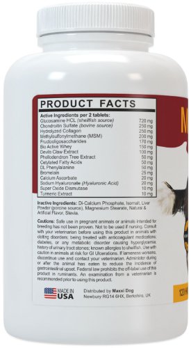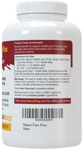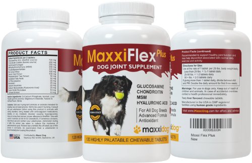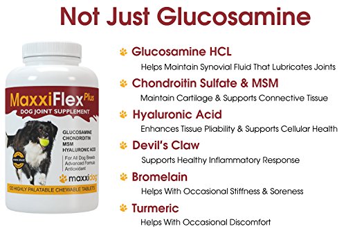 -. Feature : Dogs love the taste and their owners love the results / Supports healthy joints and flexibility, and helps maintain normal healthy cartilage / Helps maintain a normal inflammatory response and may help ease aches and discomfort associated with normal daily exercise and activity / It is all about the ingredients. MaxxiFlex Plus is formulated for results. It contains all the ingredients you expect to find in a quality joint supplement for dogs, like Glucosamine, Chondroitin, and MSM. But MaxxiFlex Plus contains additional ingredients that are as important for good joint health, like Hyaluronic Acid, Devils Claw, Bromelain, and Turmeric / We don't compromise on quality. MaxxiFlex Plus is made in the USA in GMP and NASC (National Animal Supplement Council) certified manufacturing facility using only human grade ingredients, tested for purity and potency