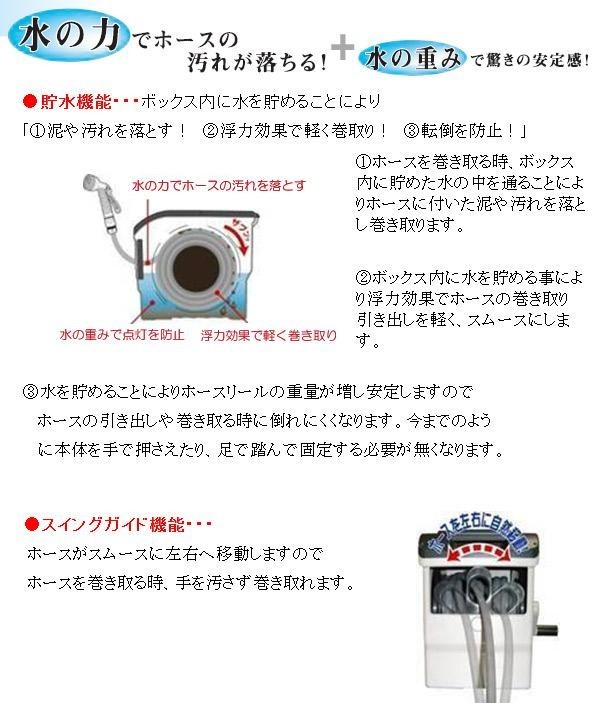 | 貯水機能でホースの汚れを落とすだけでなく、転倒を防止し浮力効果で軽く巻き取りできます。手を汚さずにホースを巻き取れるスイングガイド機能付!!用途に合わせて8種類の水形に切替可能です。 |