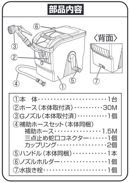 | 素材・材質 | 本体・ドラム・フタ・ハンドルSet:PP樹脂 スイングガイド:POM樹脂 水抜きキャップ:軟質PE ホース:軟質塩化ビニール(PVC樹脂) Gノズル:ABS樹脂 |