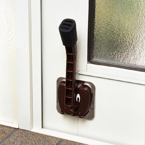 | 両手がふさがっていてもドアを好きな位置でストップできるドアストッパーです。補助板にマンモスのあごを引っ掛け固定します。スチールドアはマグネットで取り付け、粘着シール付きの補助板で木製やアルミ製のドアにも使用できます。 |
