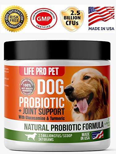 We have created our LIFE PRO PET Glucosamine For Dogs With Turmeric and Probiotics Powder because we know you love your dog and because OUR GOAL is to make your dog healthier and happier each day. Our ALL IN 1 100% natural probiotics for dogs supplement also contains turmeric and glucosamine for your dog's joint and hip support.