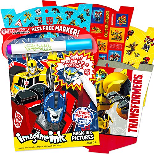 -. Feature : Transformers Imagine Ink mess-free picture book set featuring Transformers Optimus P.R.Ime, Bumblebee and more! / The coloring book set features Transformers in a 24-page mess-free coloring book, plus 1 mess-free Imagine Ink Marker. / The Transformers mess-free coloring book uses a mess free marker to reveal a rainbow of colors as you draw on the page. / Transformer sticker pad includes over 300 Transformers stickers. Perfect as Transformers party supplies, party favors, reward stickers, motivational stickers and more! / Perfect for travel and on-the-go fun. Great fun for any Transformers or Color Wonder fan!