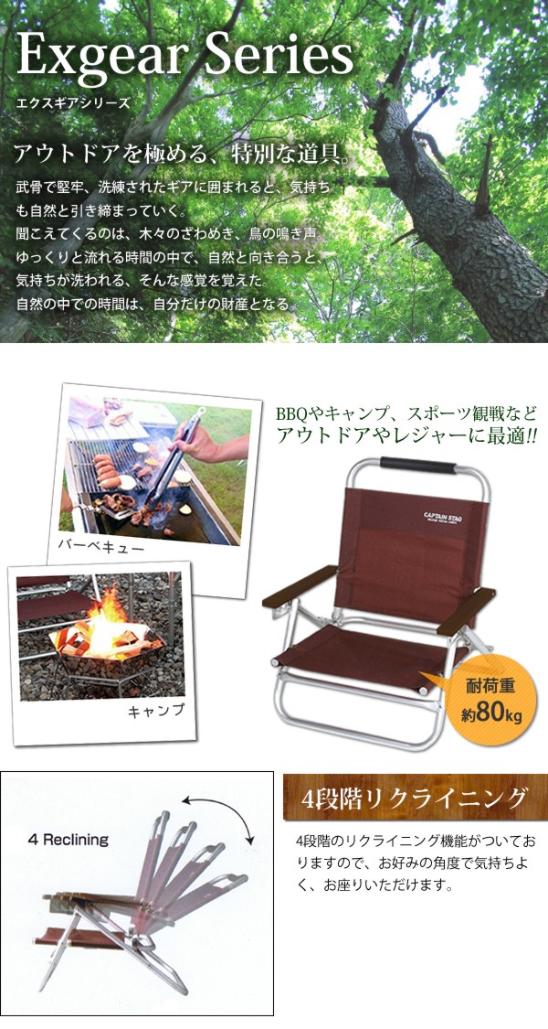 | リクライニング機能を有したロースタイルチェア。バーベキューやキャンプ、スポーツ観戦など、アウトドアやレジャーに最適です。よりリラックスした座り心地を体感していただけます。 |