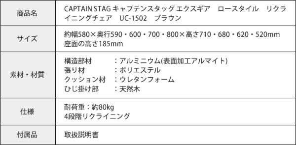 | 仕様 | 耐荷重:約80kg 4段階リクライニング |