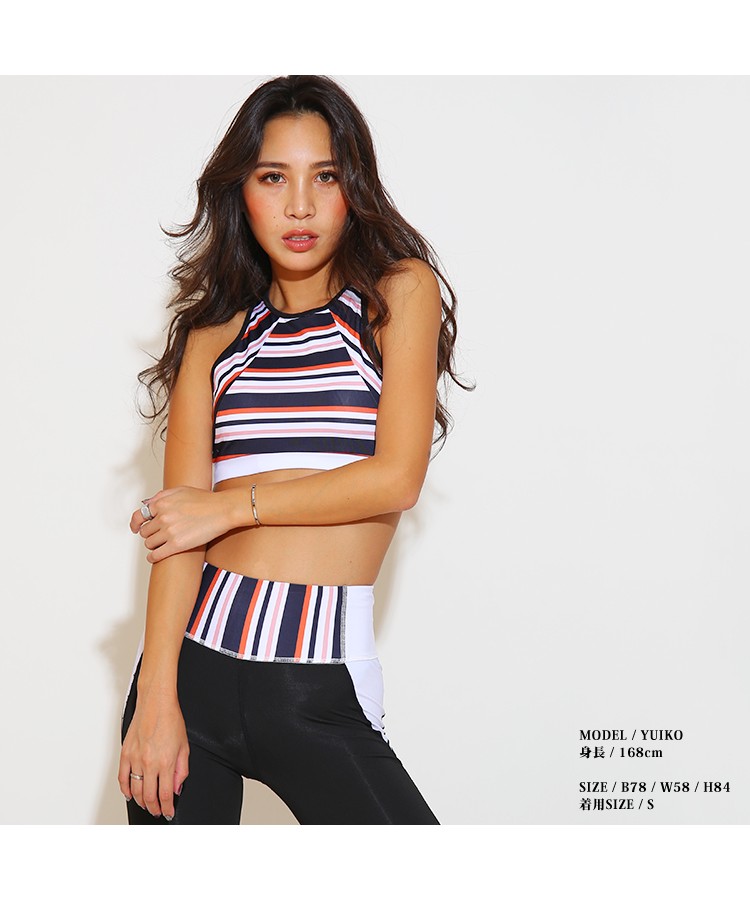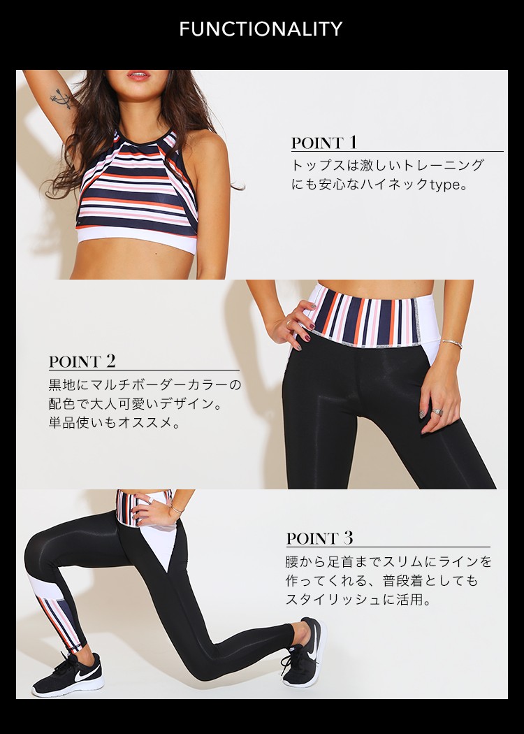 | 商品特徴 | LAVIA SPORT(ラヴィアスポーツ)から新作のスポーツウェアが入荷しました。人気の上下セットです。吸収性抜群な生地は汗を素早く吸収し思い切り汗をかいても安心!直接肌に触れるからこそ重視しなきゃならない触り心地はしっとりサラリで優しく肌に馴染みます。黒地にマルチボーダーカラーの配色で大人可愛いデザイン。タンクのアンダーライン、パンツのウエスト部分にはゴムが入っているので、しっかり体にフィットしてずれる心配がありません。ランニング、フィットネス、人気のヨガなど幅広いシーンで活躍間違いなし!トップスは激しい動きにも安心なハイネック、パットなしタイプとなります。 |