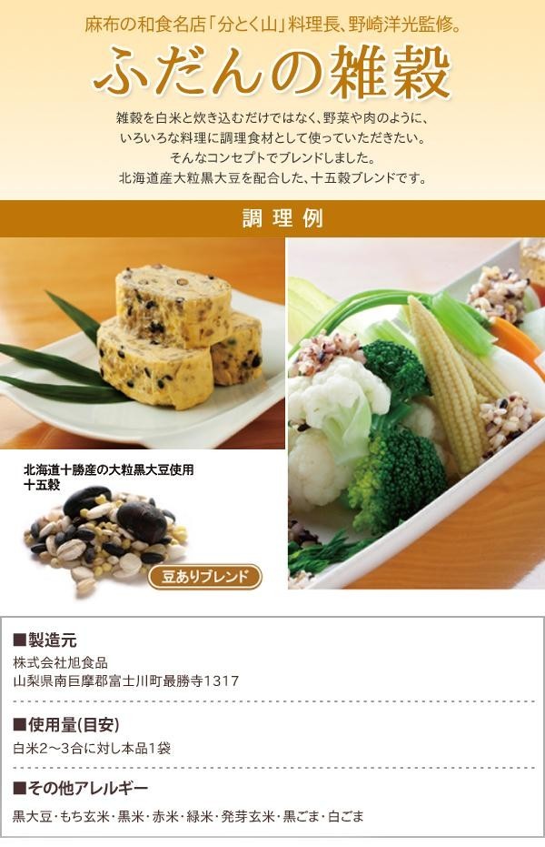 雑穀を白米と炊き込むだけではなく、野菜や肉のように、いろいろな料理に調理食材として使っていただきたい。そんなコンセプトでブレンドしました。麻布の和食名店「分とく山」料理長、野崎洋光監修。北海道産大粒黒大豆を配合した、十五穀ブレンドです。 |