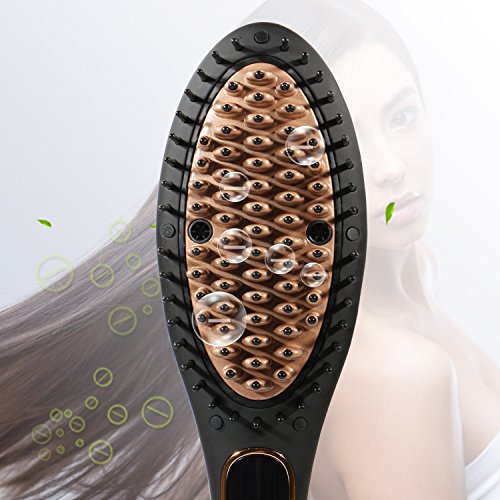 - Ceramic Hair Straightener Brush: Innovative design - The electric smoothing brush with double anion generator releases millions of negative ions, which include more moisture in the hair and maintain it. Your hair looks more neat, shiny and supple. Meanwhile, the 360 ??¡ã rotatable power cord and prevents the twining cable and makes it ideal for professional salon use, travel & home hair care.