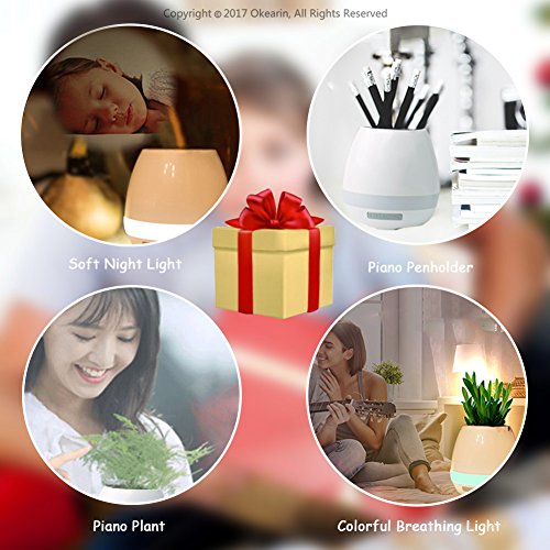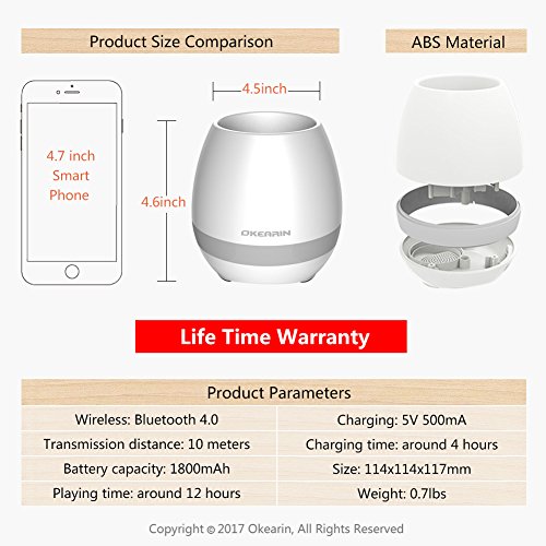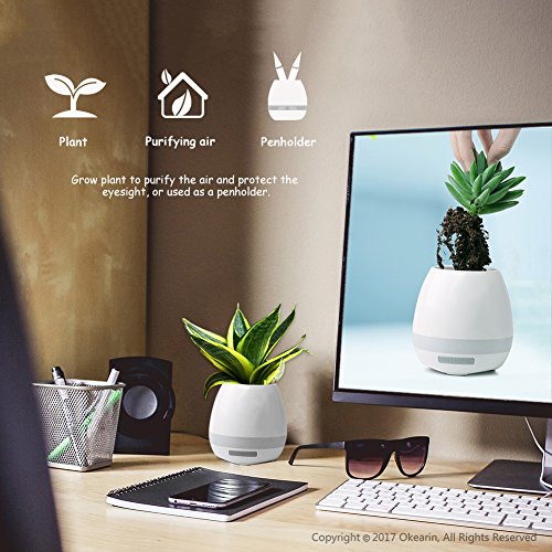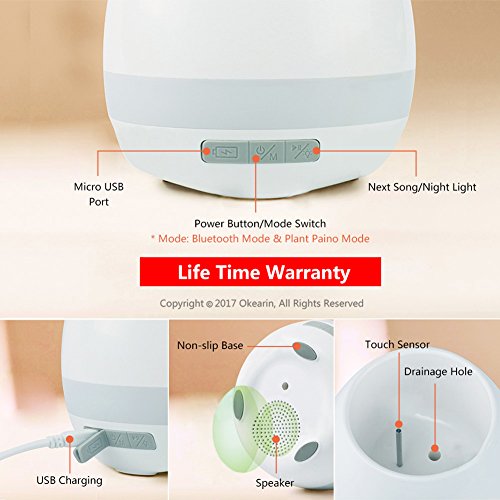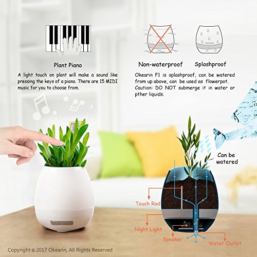 -. Binding : Electronics -. Brand : Okearin -. Color : White -. Feature : Okearin F1 is a small speaker but with wide, wide usage. Suitable for indoor and outdoor use. Multi functional creative and modern design make it to be your best festivel gift for any occasion, such as office, home, bedroom, dorms, baby room, garden, yoga, spa, party and camping / Okearin F1 is a bluetooth speaker, equipped with the latest Bluetooth 4.0 technology to maximize device compatibility and pairing speed, allows you to instantly connect to your smart devices up to 33ft away and enjoy 12 continuous hours of music in 70% volume / Okearin F1 is a soft night light and colorful breathing light, bring a feeling of safety to the people afraid of the dark and keep from tripping over when get up at night, and create a warm and sweet atmosphere / Okearin F1 is a smart flower pot, grow plant inside and touch the plant like playing the piano, every touch will make a sound like pressing the piano key. Okearin F1 is splashproof, can be watered from up above, but DO NOT submerge it in water or other liquids / Okearin support life time warranty from the date of retail purchase by the original end-use purchaser -. IsEligibleForTradeIn : 1 -. Label : OKEARIN -. Manufacturer : OKEARIN -. Model : F1 -. MPN : F1 -. PackageQuantity : 1 -. PartNumber : F1 -. ProductGroup : Speakers -. ProductTypeName : SPEAKERS -. Publisher : OKEARIN -. Studio : OKEARIN -. Title : Okearin F1 Bluetooth Speakers Night Light Breathing Light Music Flower Pots Smart Plant Pots Play Music by Touching Plants Rechargeable Indoor Outdoor Office Home Decor Festivel Gift (White No Plant)