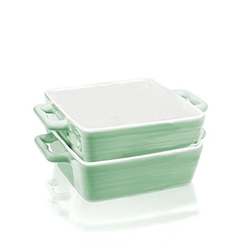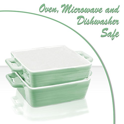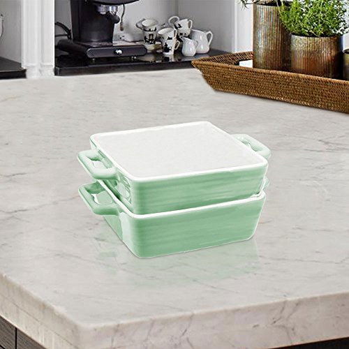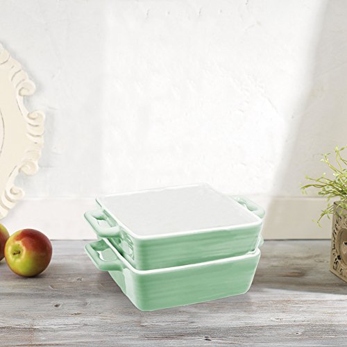 Mini Porcelain Baking Dish Pan with Handles ~ Casserole, Quiche, and Pie Baker - Oven, Microwave, and Dishwasher Safe (Pastel Green, Set of 2)