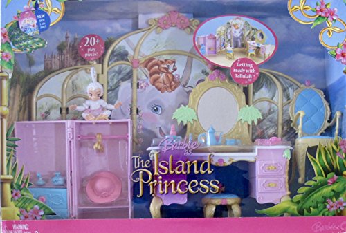 -. Feature : Barbie as The Island P.R.Incess 20+ Pieces! Getting Ready with Tallulah Toy! is a 2007 Mattel production. / INCLUDES: Tallulah Figure approx. 3" tall, Vanity Table w 'Mirror '& Drawers (Vanity approx. 7.5" w across front), Stool w/blue top, Chair w/blue back, 3 Piece "Screen" w Pictures of Tika & Sagi (Elephant & Red Panda), Pink Armoire approx. 6" tall x 6" wide (Open), 3 Yellow Hangers, Pink plastic Hat, Blue Perfume Atomizer, a Blue Tea Set (has 2 Cups & Saucers, Tea Pot & Gold color Tray), a Pink Crown, a Pink Hair Brush, & More Accessories. / SEE MORE DETAILS in PRODUCT DESCRIPTION Below. Included Items are Pretend & Intended for Barbie Doll & other 11.5" Fashion size Dolls; NO DOLLS are included. Playset can be used with other size Dolls, as YOU Prefer. / For Ages 3+ Years. All sizes & details are provided to the best of my ability & may not be exact & may vary. / *NEW & SEALED, but Box ONLY has corner wear (rubs, small tears, etc) & other minor rubs/wear; toy NOT affected. For Box Condition see CONDITION NOTE or Email Seller for Details.