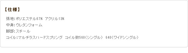 材質:側地-ポリエステル87%・アクリル13%、中身-ウレタンフォーム、脚部-スチール、コイル-マルチラスハードスプリング・コイル数560