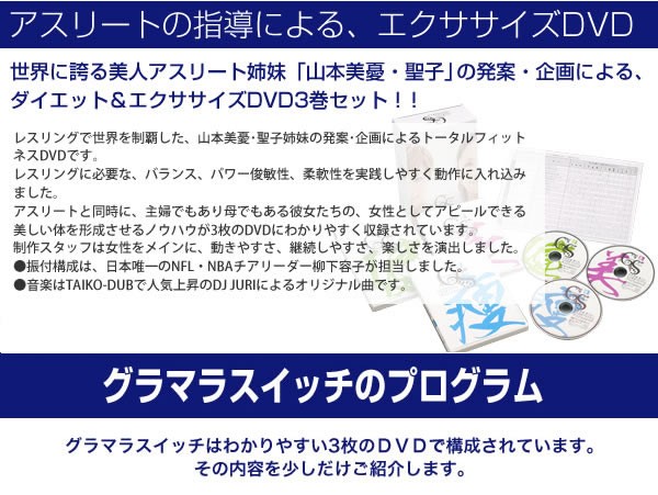 山本美憂・聖子姉妹の発案・企画によるトータルフィットネスDVD。レスリングに必要な、バランス、パワー俊敏性、柔軟性を実践しやすく動作に入れ込みました。女性としてアピールできる美しい体を形成させるノウハウが3枚のDVDにわかりやすく収録されています。 ※サプライヤー直送品 ご注文後、当日~1営業日後の出荷となります【商品名】エクササイズDVD 山本美憂・聖子の「グラマラスイッチ」