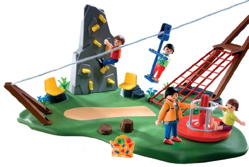 -. Feature : The SuperSet Activity Playground has some outdoor fun for everyone / Take the PLAYMOBIL figures for a spin on the rotating carousel / Fly through the air with the functioning zip line or make it to the top of the rock-climbing wall / Figures can bend, sit, stand and turn their heads / Includes four figures, playground setting with chairs, tote bag, and other accessories