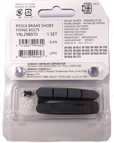 Shimano Replacement pads for Road brake shoes Shimano Cartridge-type road brake pads fit models: Dura-Ace BR-9000, BR-9010, BR-7900, BR-7800, BR7700 Ultegra BR-6800, BR-6700, BR-6600, BR-6500 105 BR-5800, BR-5700, BR-5500 Non-Series BR-R600, BR-R561, BR-R560, BR-CX70. -1mm reduced shoe thickness for increased rim clearance. R55C4: High-end race brake pad with excellent wet and dry performance. Color: Black. Rim Compatibility: Carbon. Intended Brake Type: Caliper. Pad Attachment Style: Bolt-In (Caliper). Pad Type: Replacement Insert - Cartridge.Feature