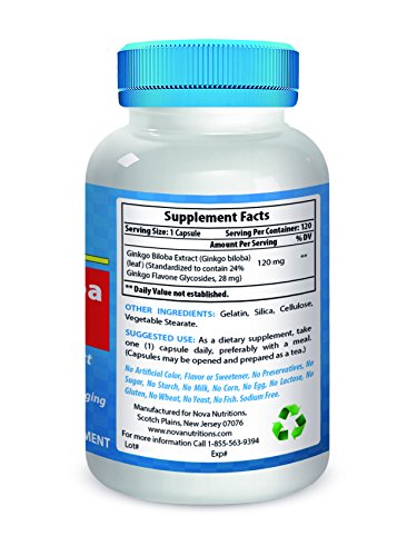 -. Binding : Health and Beauty -. Brand : Nova Nutritions -. EAN : 0732363270881 -. Feature : Supports healthy brain function and performance* / Promotes memory and cognition* / Supports healthy circulation in the lower legs* / standardized to 24% ginkgo flavone gylcosides per capsule / Nova Nutritions products are manufactured to high standards of quality, efficacy and safety. All Nova Nutritions Products are manufactured in accordance with Good Manufacturing Practices (GMP), among the highest standards in the world -- Proudly Made in USA -- Purity & Potency Guaranteed -. Label : Nova Nutritions -. LegalDisclaimer : *These statements have not been evaluated by the Food and Drug Administration. This product is not intended to diagnose, treat, cure or prevent any disease. -. Manufacturer : Nova Nutritions -. ProductGroup : Health and Beauty -. ProductTypeName : HEALTH_PERSONAL_CARE -. Publisher : Nova Nutritions -. Studio : Nova Nutritions -. Title : Gingko Biloba 120 mg 120 Capsules by Nova Nutritions -. UPC : 732363270881