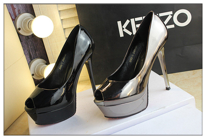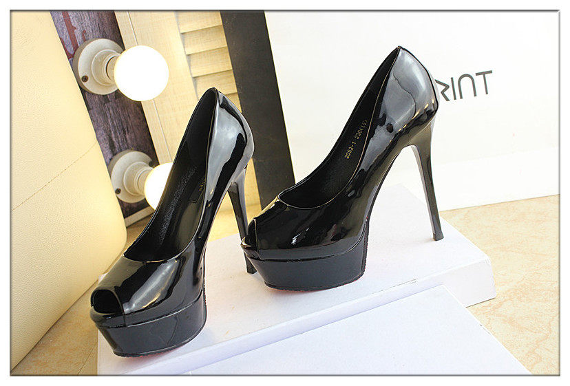 12cm超高跟细跟鱼嘴鞋亮漆皮枪色防水台时尚高跟单鞋黑显瘦浅口女